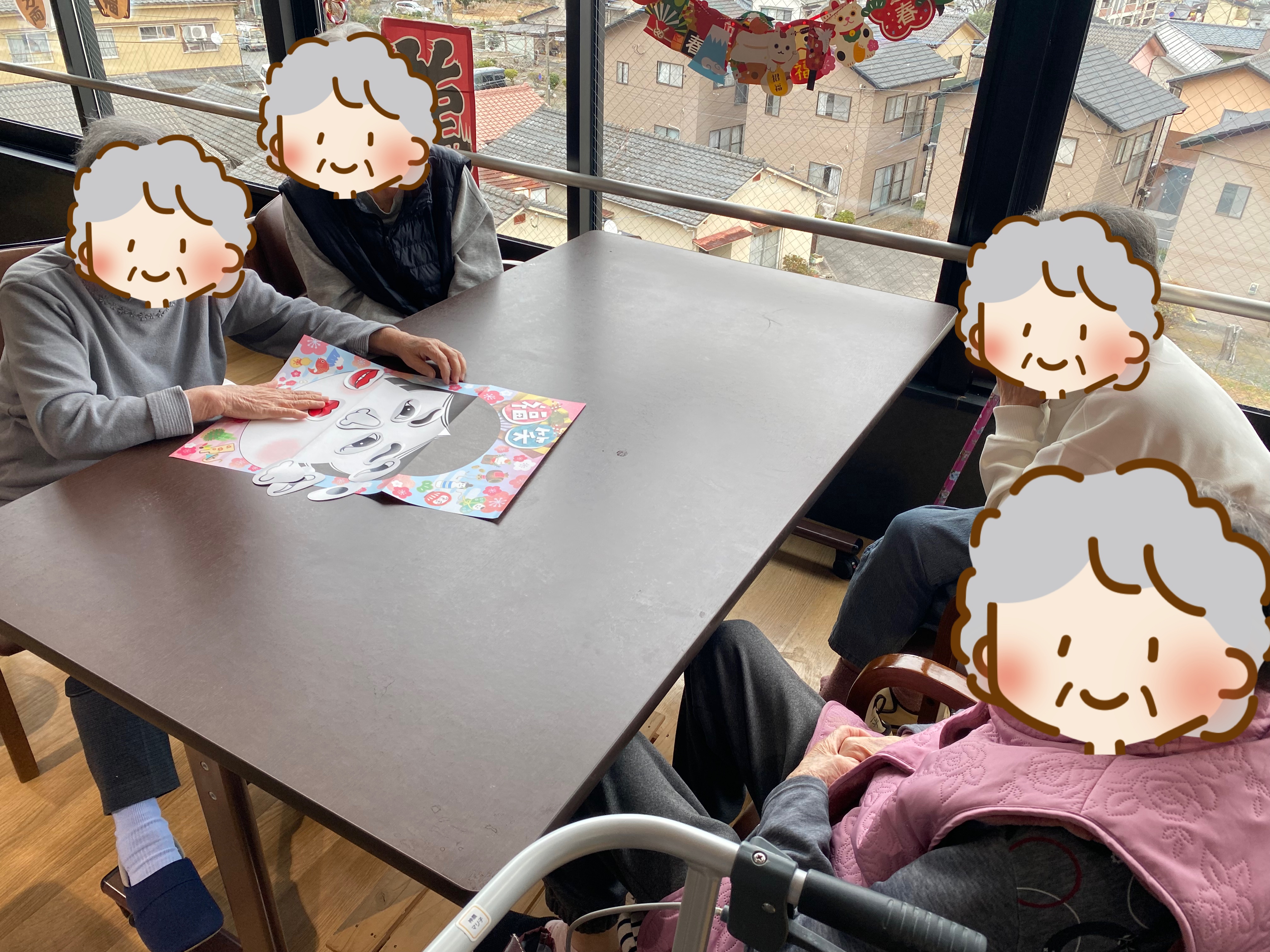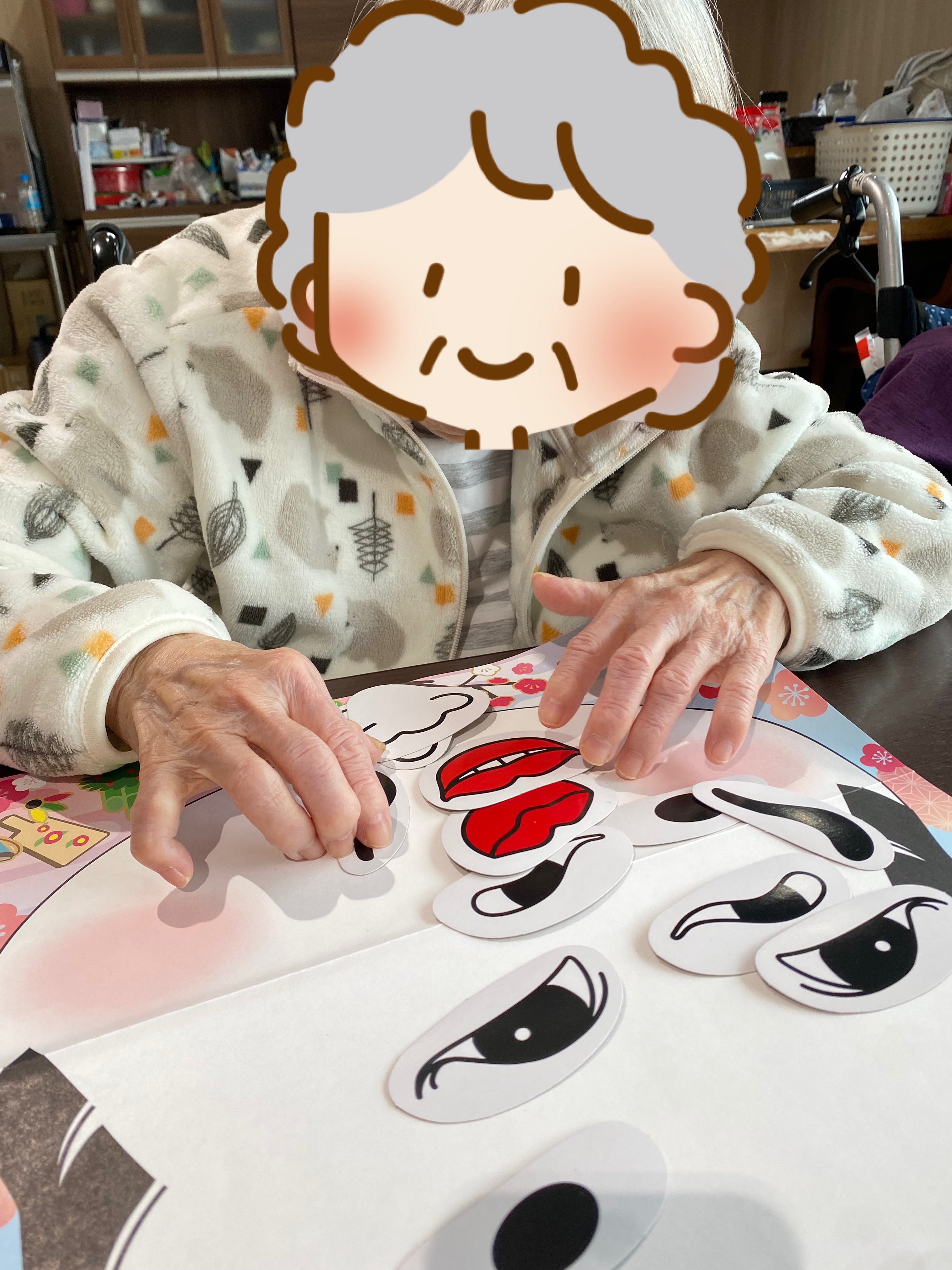 一人でするのが難しいと同じテーブルの方と協力される場面もありました。笑いがあふれる福笑いとなりました。