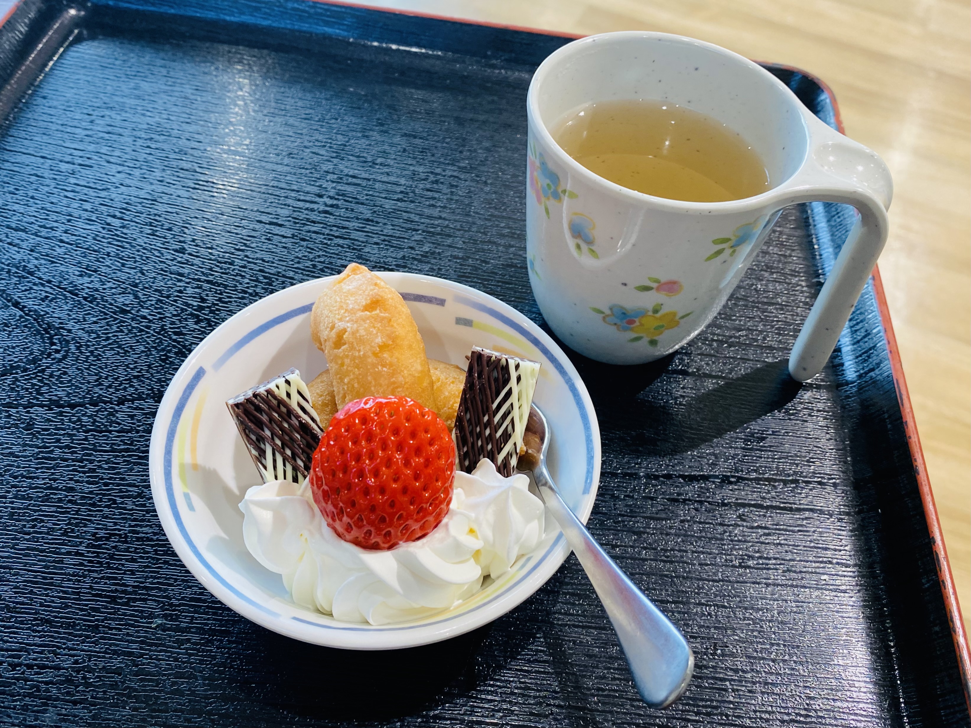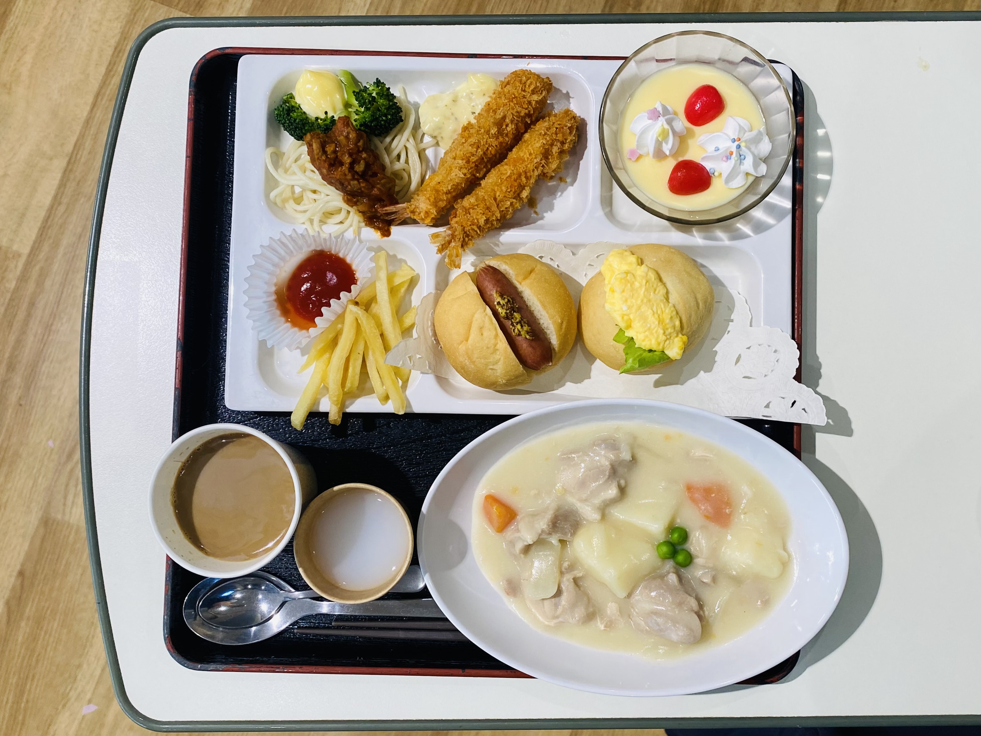 今回の昼食は、洋食プレートです。シチュー、エビフライ、スパゲッティが人気でおかわりされる方が多かったです。デザートの手作りプリンも好評でした。