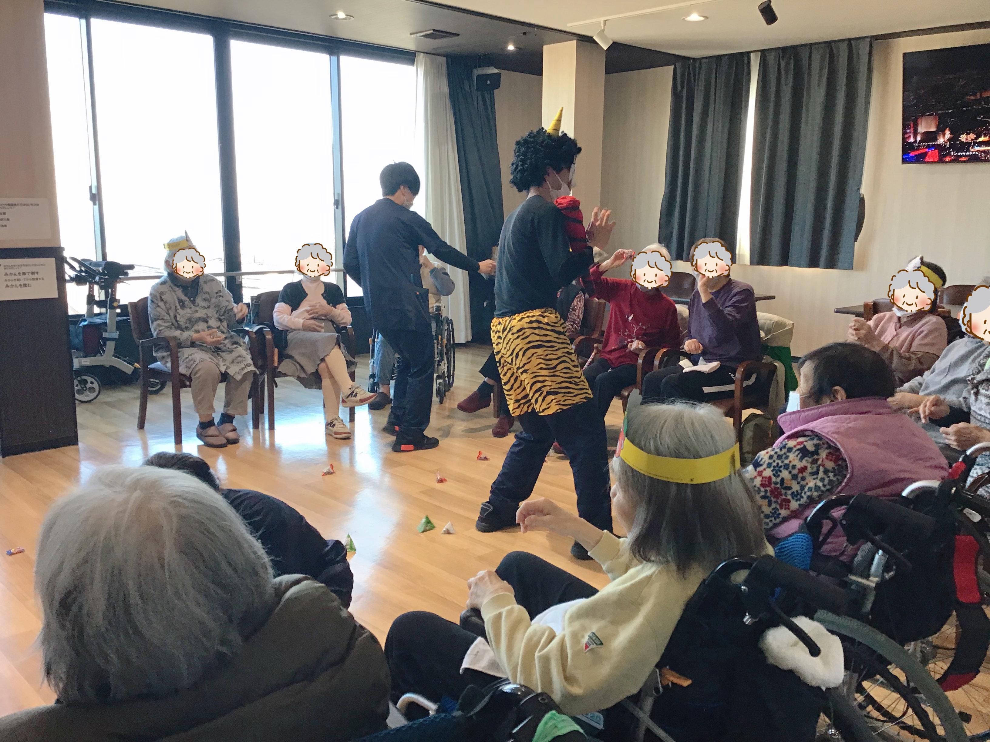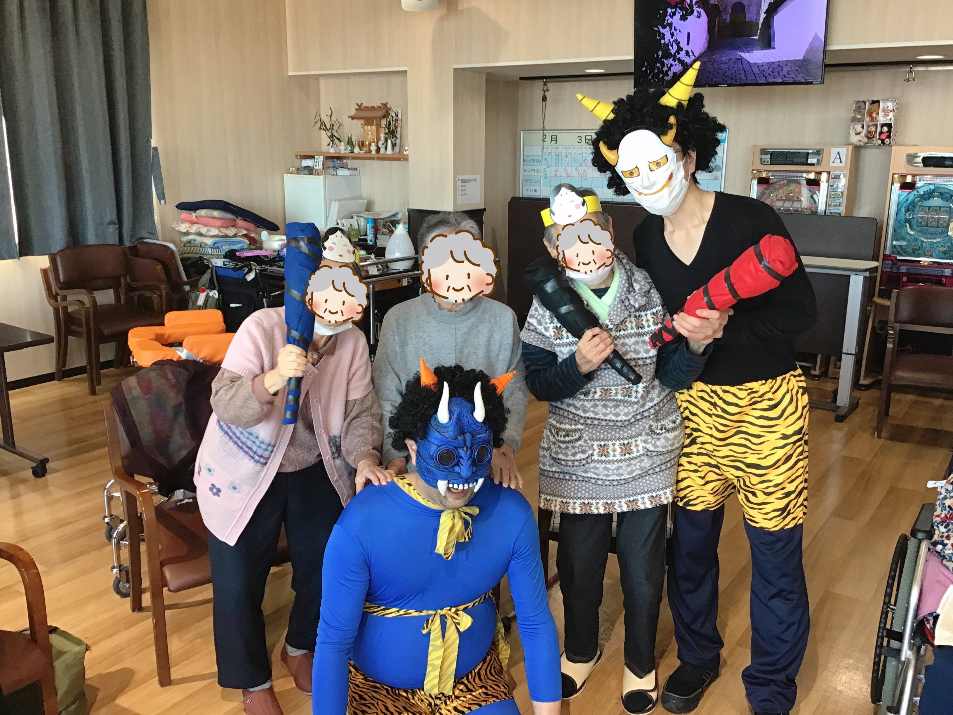 午後からは、職員が鬼役となり豆まきを行いました。鬼を近くまで呼んで豆を投げたり鬼の金棒を取ったり楽しそうに豆まきをされていました。豆まきの後に写真撮影をし節分に関するクイズ大会を行いました。