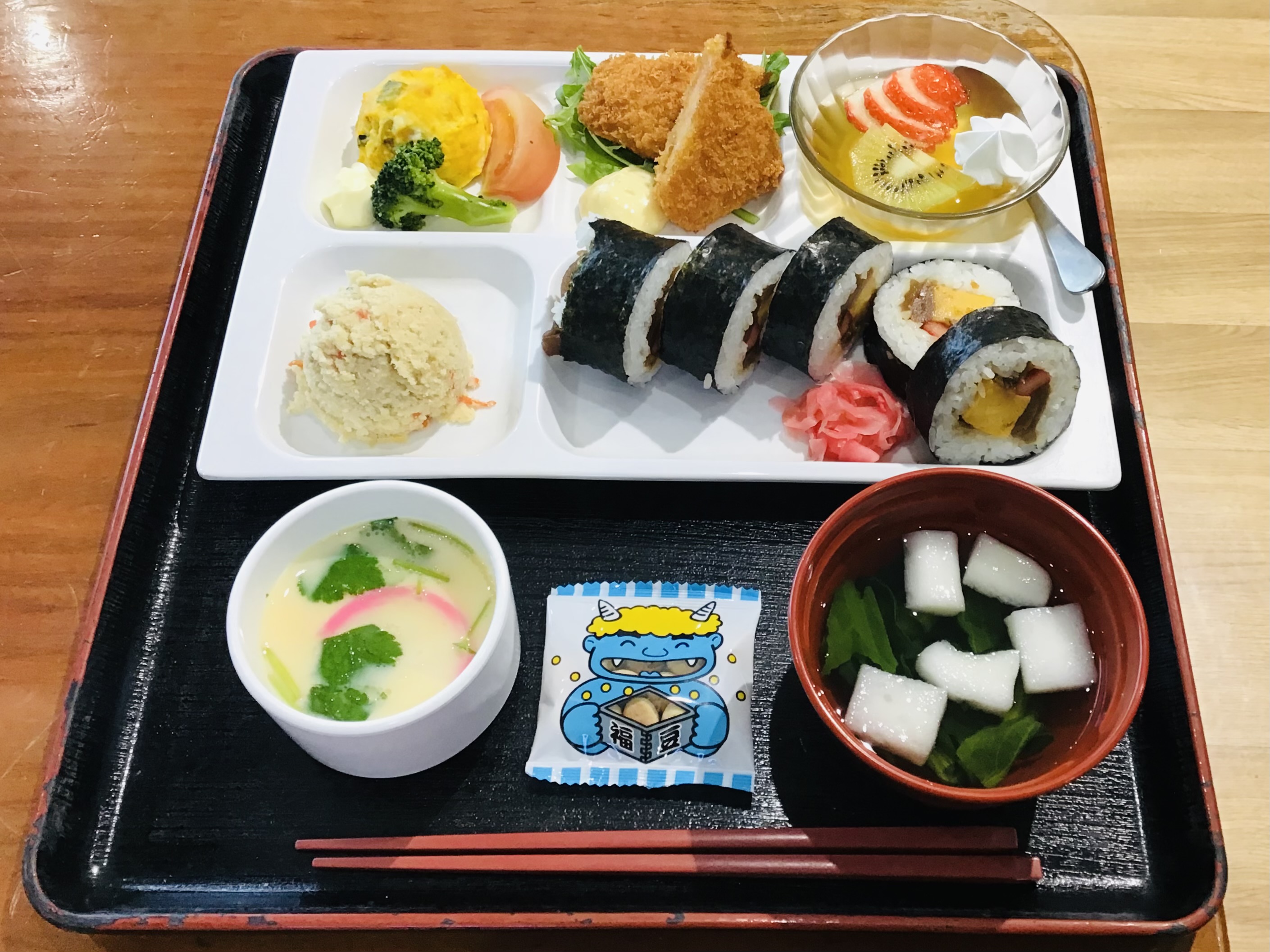 南南東ってどっち?高崎山の方?など言いながら美味しそうに恵方巻きを食べられていました。おかわりされる方も多かったです。普段少食の方も毎回行事食では、完食されたりおかわりされるため嬉しく思います。