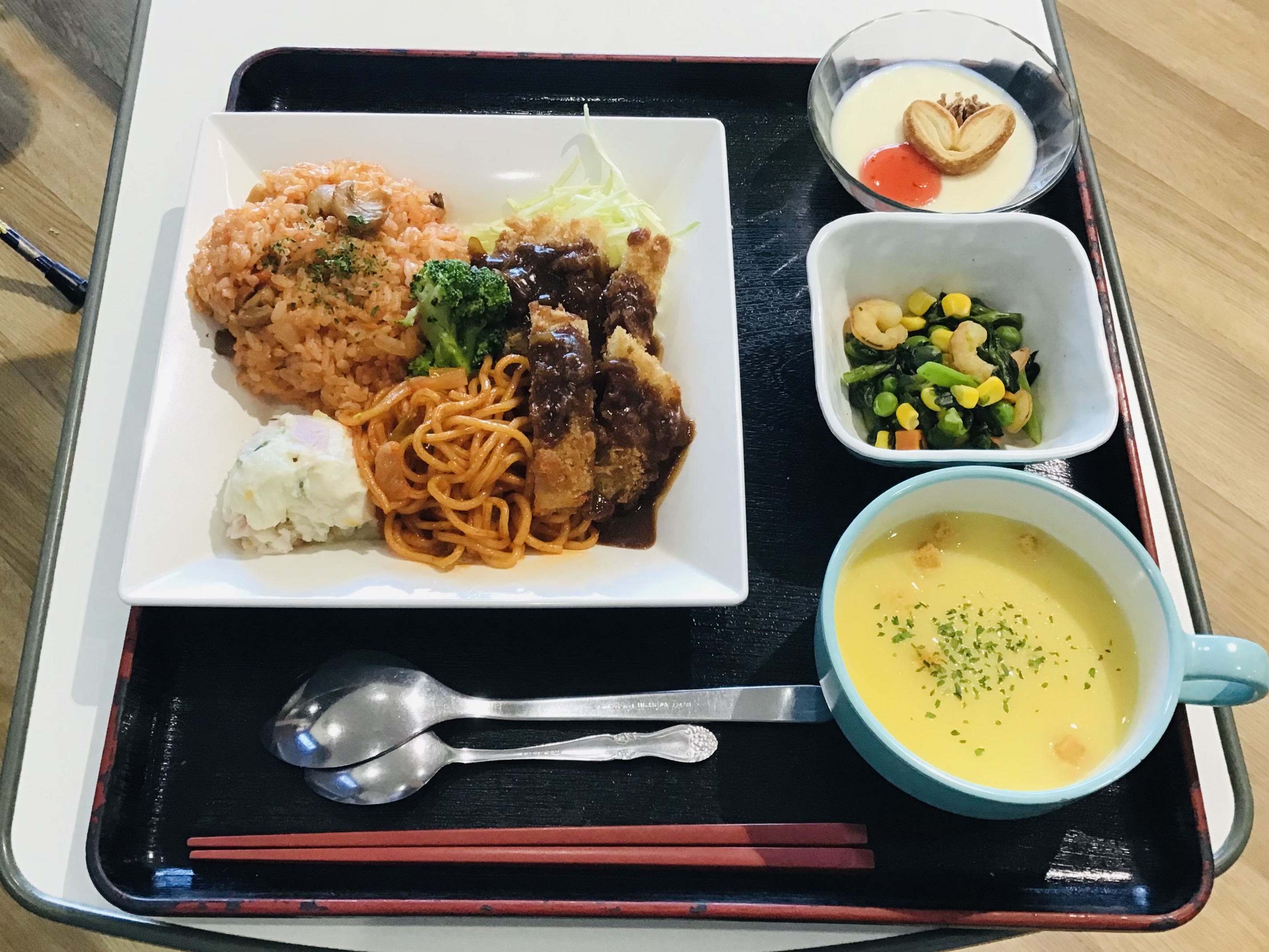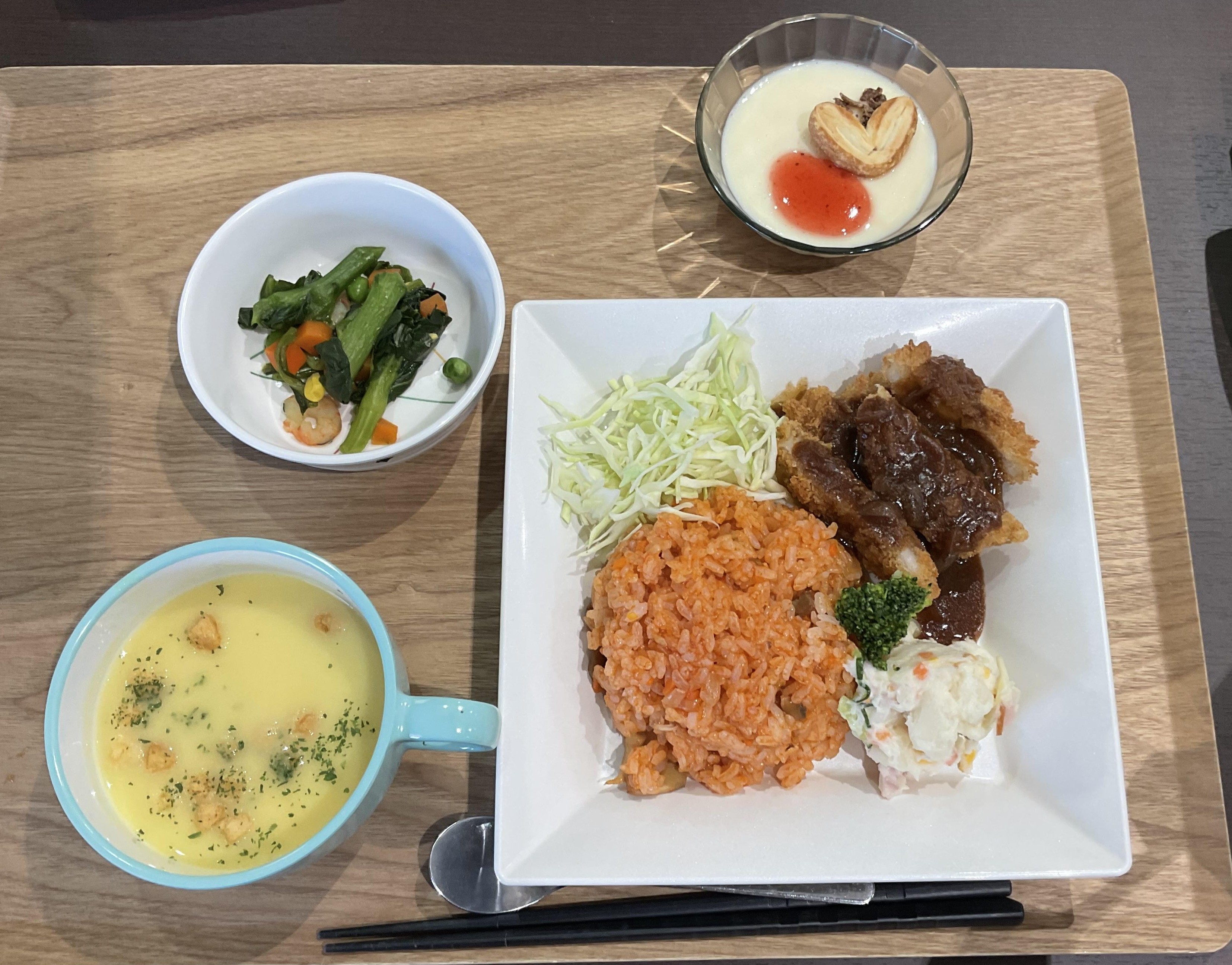 昼食は、チキンライス、ロースかつ、ナポリタン、ハムチーズポテト、菜の花とエビのソテー、コーンクリームスープ、バニラババロアでした。相変わらずおかわりされる方が多く美味しいと喜ばれていました。