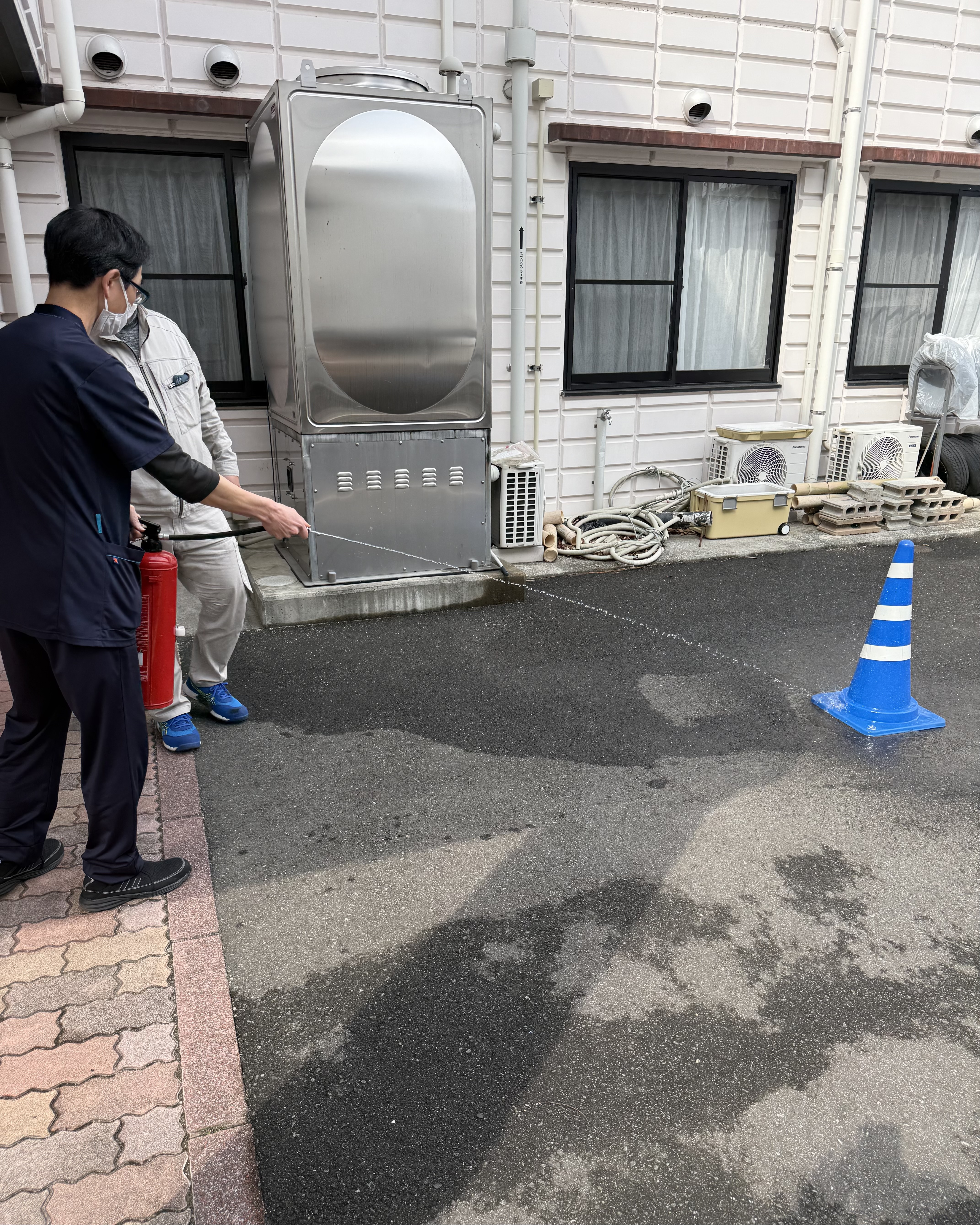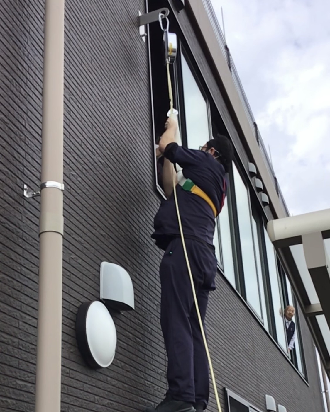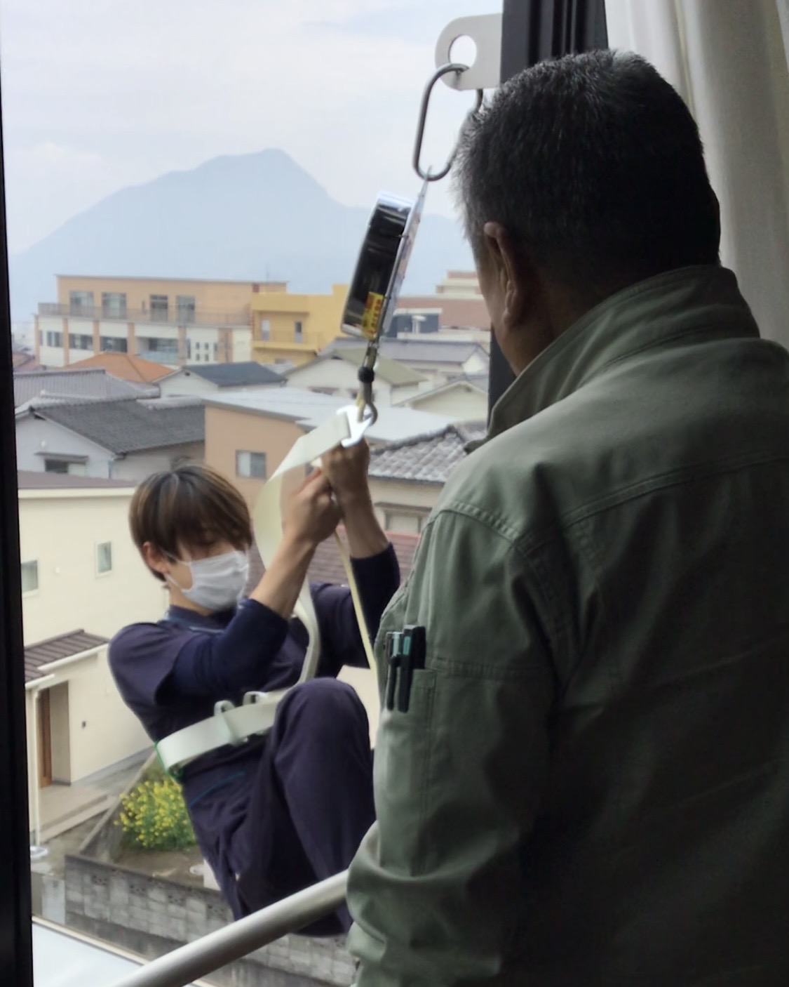 職員は消火器の使用手順を再確認し初期消火の訓練も行いました。オリローの使用手順の確認し実際に職員が降りてみました。また、通報担当、避難誘導担当、安全確認担当など役割分担を明確にしスムーズに対応できるよう連携を確認しました。